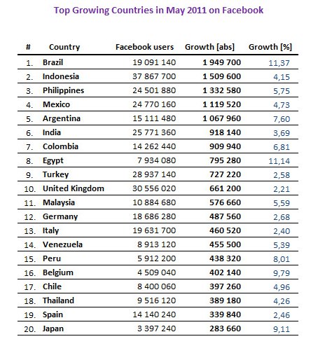 Den grössten Zuwachs verzeichnete im Monat Mai Brasilien mit mehr als 1,9 Mio. neuen Facbooknutzern.